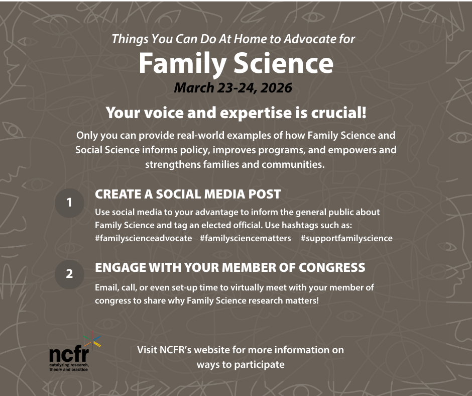Join NCFR for Social Science Advocacy Day 2026, hosted by the Consortium of Social Science Associations (COSSA). Current registration is $125/members and $50/students. Make sure to register now!